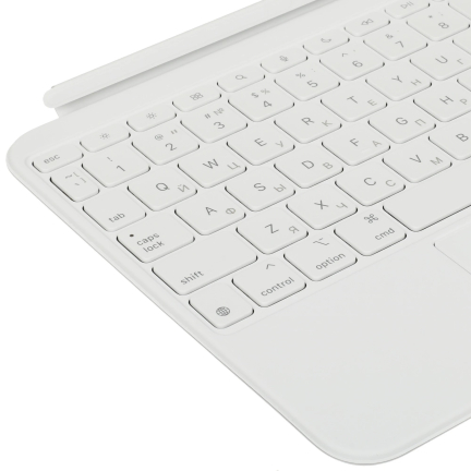 Клавиатура и опыт набора текста Основное внимание здесь уделено именно печати. Клавиши полноразмерные, с равномерной подсветкой и мягким, но ощутимым откликом. Ход около 1 мм создаёт баланс между скоростью и точностью, поэтому даже при длительном наборе текста пальцы не устают так быстро. Раскладка привычная, расстояние между клавишами выдержано, из-за чего ошибок при слепой печати становится меньше. Трекпад поддерживает жесты iPadOS, и это заметно упрощает навигацию: переключение приложений, прокрутка страниц и работа с текстом происходят быстрее, без постоянного касания экрана. В итоге взаимодействие с системой становится ближе к ноутбучному сценарию.